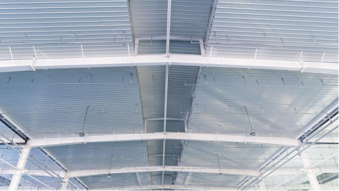 項目屋面系統采用現場(chǎng)復合方式,底板選用冠洲品牌白灰色PE涂層鋼板,使車(chē)間內部整潔、明亮,外板我們?yōu)闃I(yè)主推薦使用了直立鎖縫820型,360°咬合工藝,板型采用固定支座隱藏式安裝,表面無(wú)螺釘穿透,使整個(gè)系統具有絕佳的氣密性及抗風(fēng)揭能力,面板材質(zhì)選用上海寶鋼AZ150高品質(zhì)鍍鋁鋅本色板,使工程在美觀(guān)、安全的基礎上,兼顧了經(jīng)濟性及耐久性。